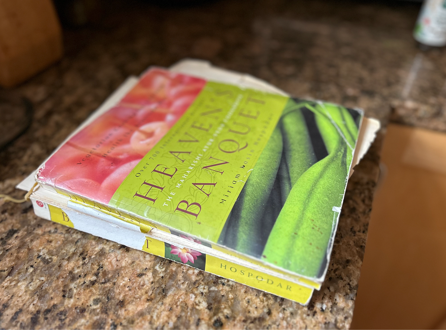 This one is my favorite veggie recipe that I have made countless, countless times, for myself, my friends and family, and potlucks. It comes from a book called Heaven’s Banquet: The Maharishi Ayur-veda Cookbook by Miriam Hospodar. I found this gem almost 20 years ago. It includes a lot of information on doshas (mind-body constitution), optimizing your digestion, and powerful, inspirational quotes that bring everything you learn in the book home. Here’s how much I love and use this book: