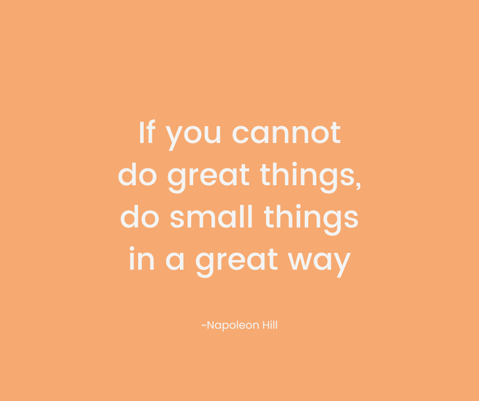 For me, focusing on the small things in a great way means knowing what’s important to me, where I want to go with it, and making sure I include a piece of that in my day, every day, in full zen mode. Which, by the way, when I allow myself to get into zen mode, time becomes generous, and any work that I do becomes pleasureful. I can’t lose.