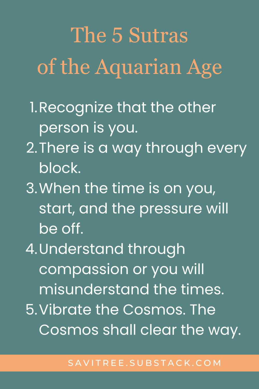 You might have heard of Patanjali’s Yoga Sutras; there are 195 of them; sutras, that is. Well worth the study if you’re thinking of putting in the time. But I am here to share with you something more bite-sized today. The Kundalini Yoga tradition brings you Five Sutras of the Aquarian Age. This [Aquarian] Age refers to an era of light battling dark, where the vertical hierarchical system of access and opportunity works to become horizontal, more equal and accessible. It is helped by technology. It doesn’t seem so right now, but this is the battle, isn’t it? So much information at our fingertips, and yet so much limitation. So much illumination yet so much darkness. The information we hone in on seems to push binary thinking - you’re either on this side or that - dividing us further and creating more confusion, overwhelm, and anger.