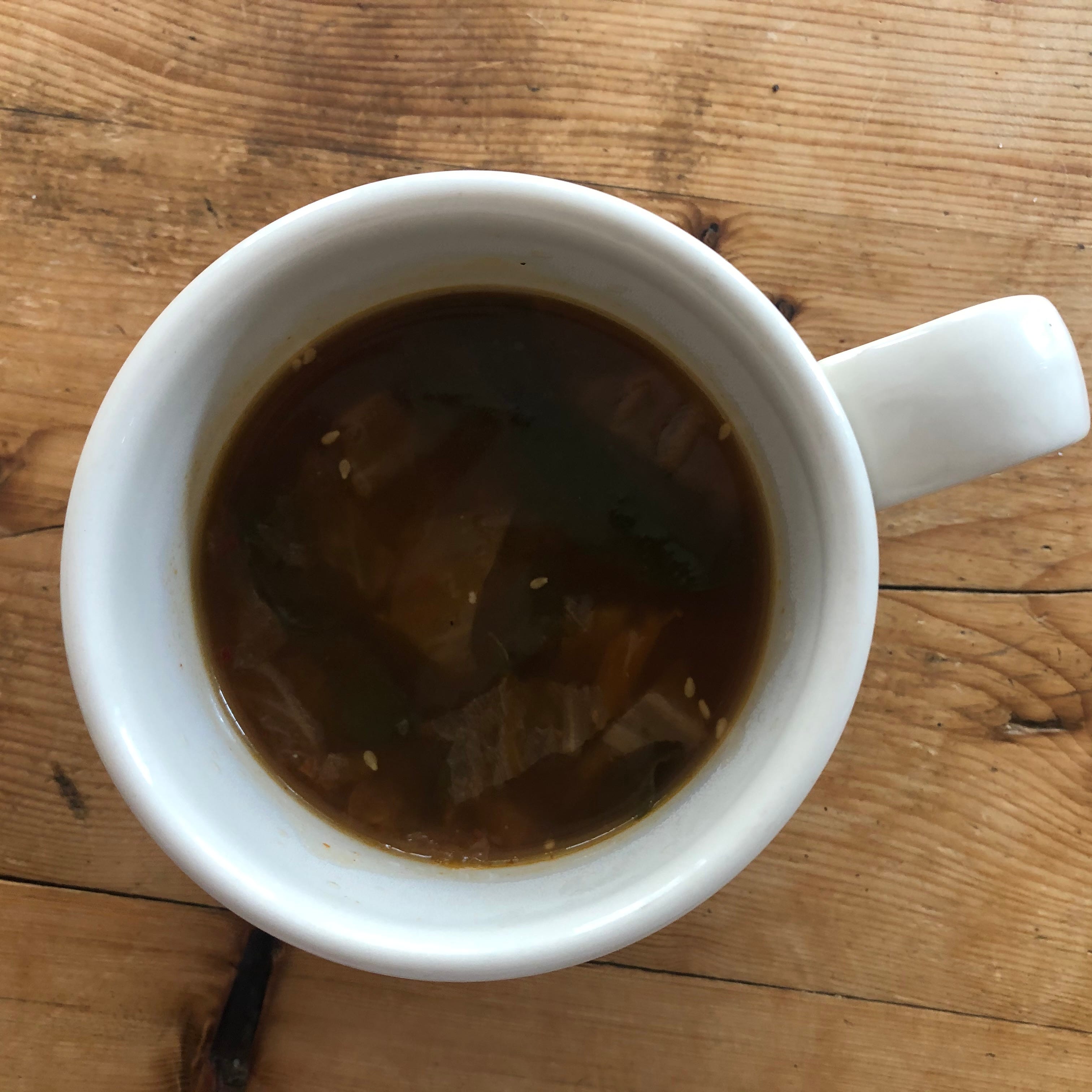 You can also drink a simple miso, chicken, veggie, or bone marrow broth with a few or no veggies. This is not a great image, but here’s one of red miso with a little bit of kimchi and sesame seeds I enjoyed one day from a mug.