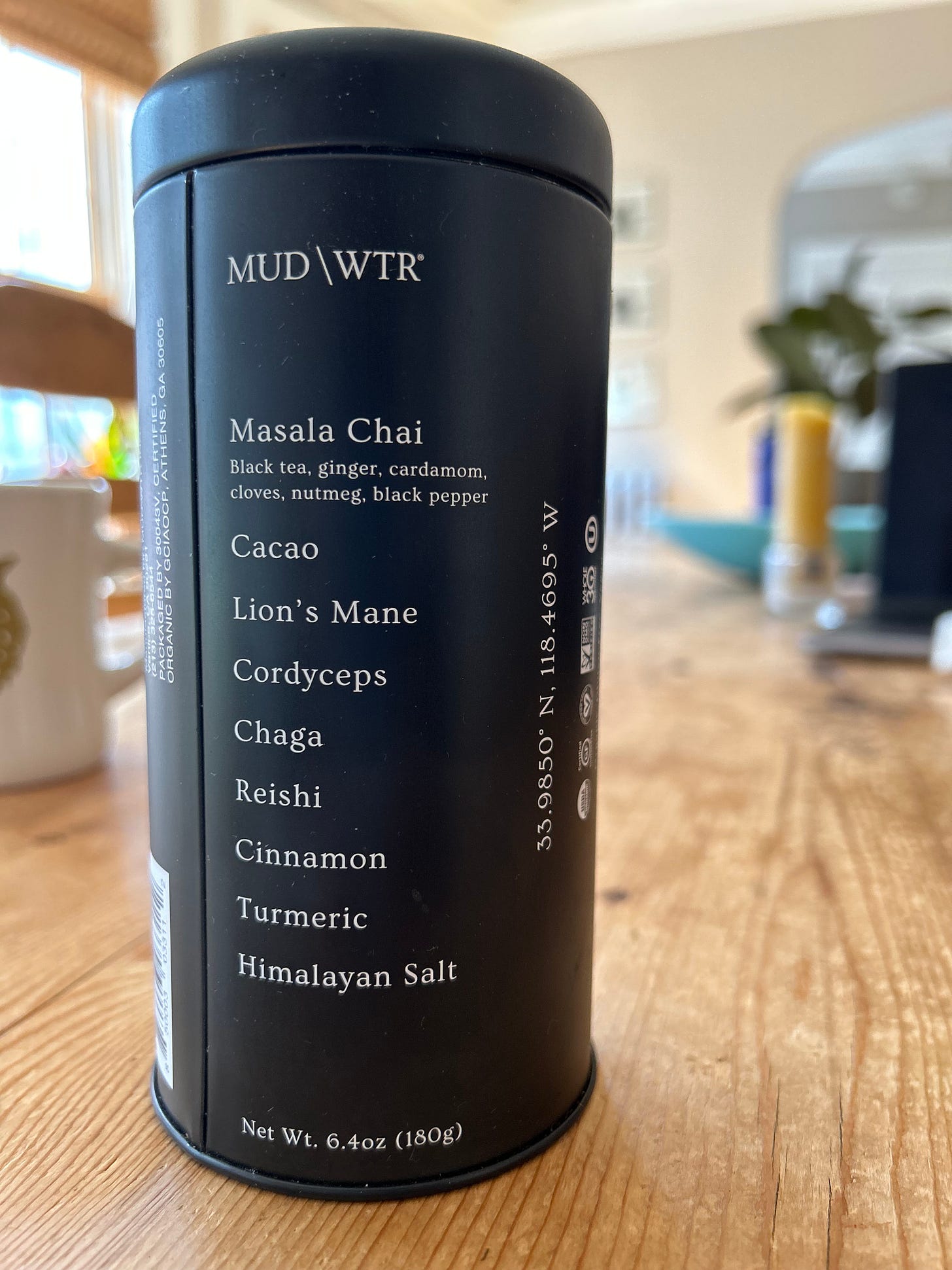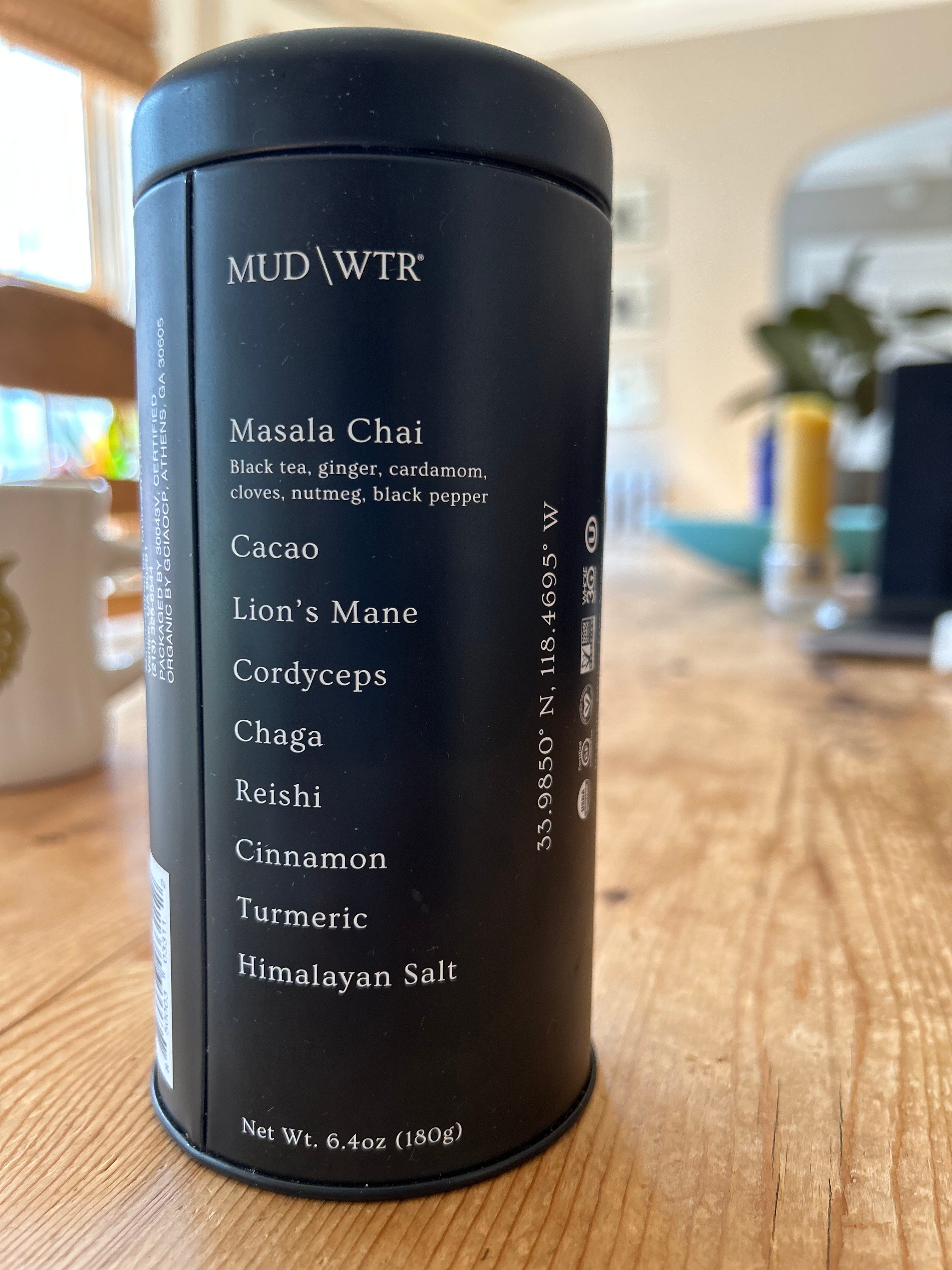 Mud/wtr: is a brand of “coffee alternative” made with mostly medicinal mushrooms, an adaptogen that I use to boost my immune system. I very much love this mug of mud and enjoy it almost every morning around 10 am.