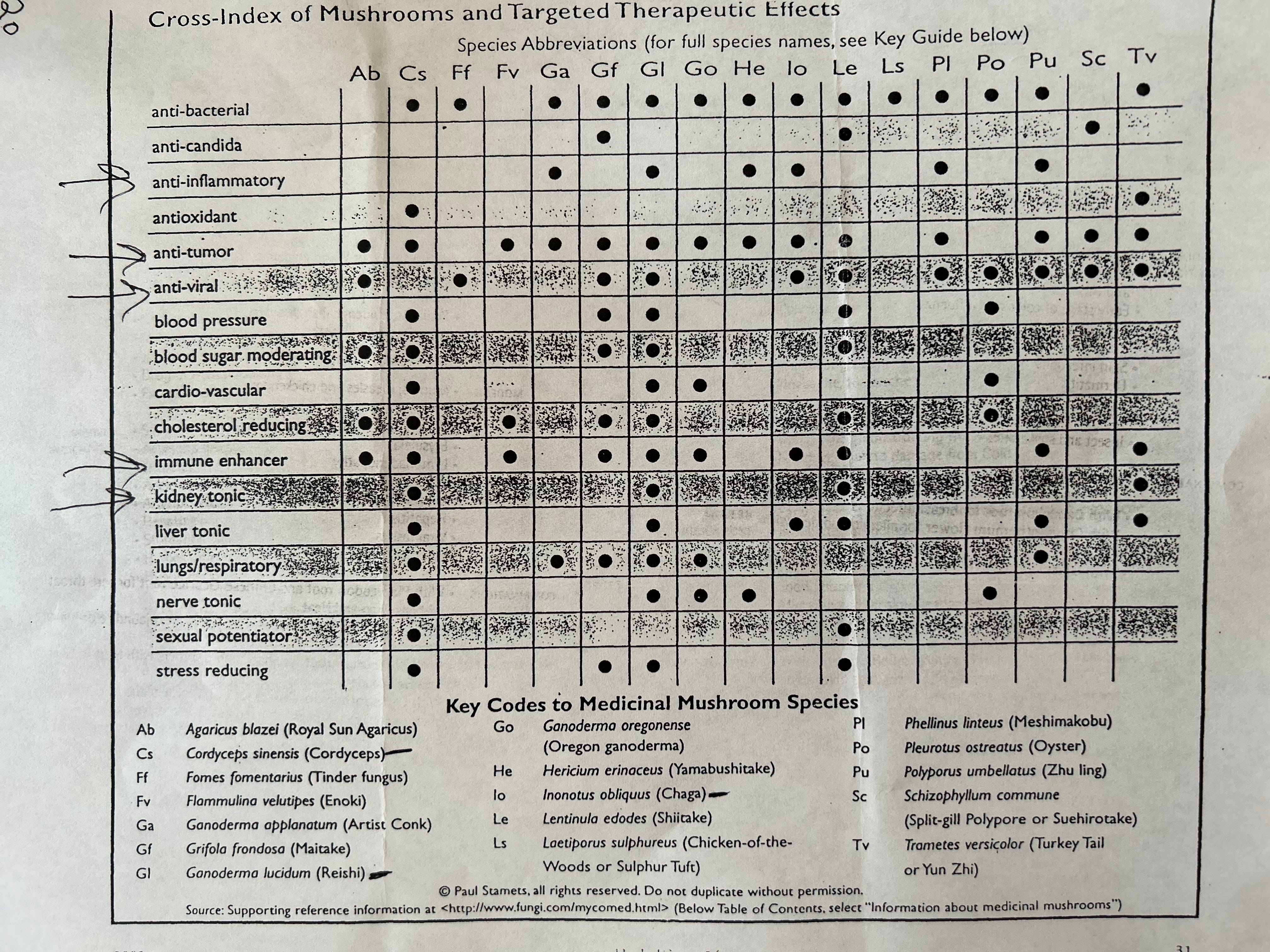 My TCM (Traditional Chinese Medicine) doctor gave me this chart below. The arrows are what my doctor wanted me to look for to improve my immunity. The dashes you see below the chart, under Key Codes, are the mushrooms contained in MudWtr.